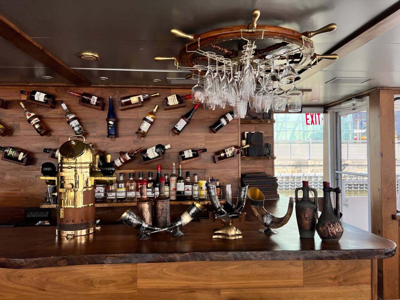 Guests enjoy drinks at two full bars, one on each deck, where expert bartenders craft creative cocktails and serve premium wine, beer, and liquor.
